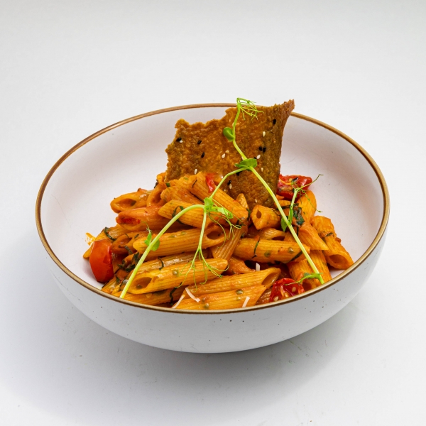 Паста пенне, перец чили, чеснок, томатный соус, базилик, пармезан.