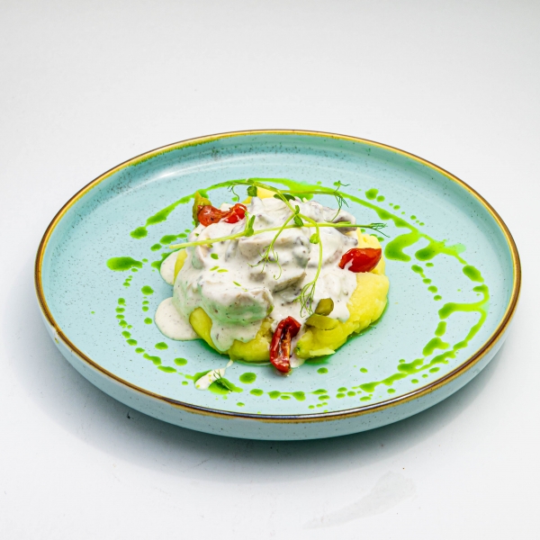 Классика, знакомая каждому! Сочная телятина со свежими грибами под сливочным соусом, подается с нежнейшим картофельным пюре.