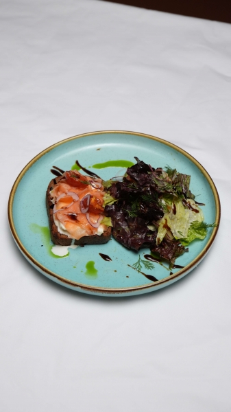 Солодовый хлеб в сочетании с нежной страчателлой, слабосоленой семгой «Гравлакс», вялеными черри и миксом салата.