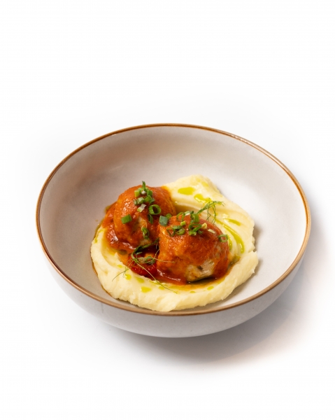 Куриные фрикадельки в хрустящей бархатной панировке с картофельным пюре и томатным соусом.
