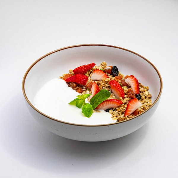 Питательный завтрак из смеси полезных злаков, орехов и фруктов.