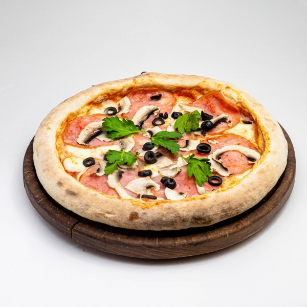 Легкий и сочный вкус, основой которого является говяжья ветчина, грибы шампиньоны, домашний сыр Моцарелла, оливки, маслины и томатный соус.