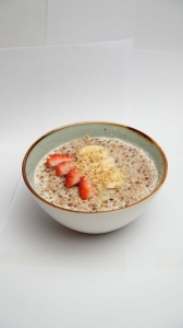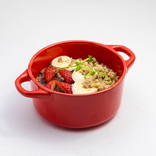 Каша гречневая, приготовленная на молоке и сливках. Подается с бананом, орехами и клубникой.
