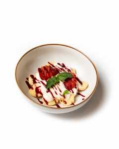 Нежные ленивые вареники из творога и манной крупы с добавлением фисташки — в идеальном сочетании с ванильно-сливочным соусом и ягодным конфитюром.