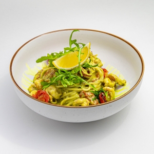 Изысканное сочетание двух соусов (сливочный соус и соус Песто) с ароматными креветками.