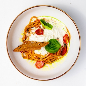 Паста Италия, соус томатный, масло чесночное, масло сливочное, помидоры черри, сыр Страчателла, базилик.