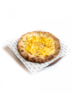 Ароматная пицца с кремовым соусом, расплавленным сыром чеддер и хрустящим картофелем фри.