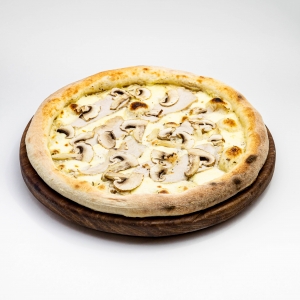 Пицца на основе домашнего сыра Моцареллы, куриного филе, шампиньонов и сливочного соуса.