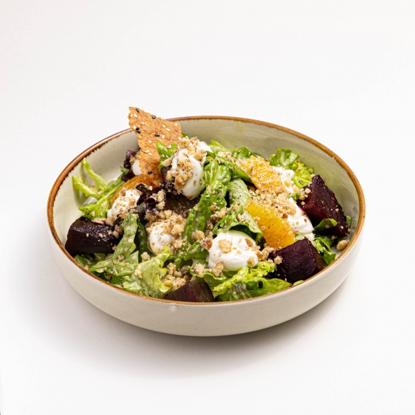 Салат на основе томленой свеклы и мякоти апельсина в сочетании с сырным муссом и грецкими орехами, заправленный цитрусовым соусом. Подается с миксом салата.