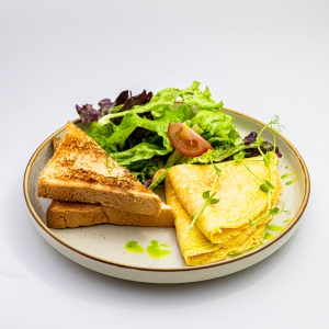 Нежный воздушный омлет - идеальный завтрак для приверженцев утренней классики. Подается с помидорами, огурцами и микс-салатом.