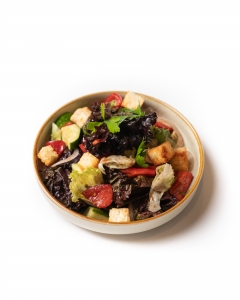 Лёгкий салат из свежих овощей с чесночными крутонами и фирменной гранатово-оливковой заправкой.