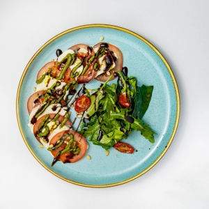 Классический итальянский салат на основе свежих томатов, домашнего сыра Моцарелла, базилика, рукколы и кедрового ореха в сочетании с соусом Песто.