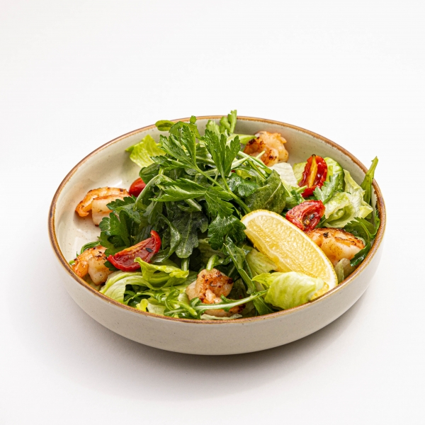 Средиземноморский салат на основе креветок, рукколы, вяленных томатов, авокадо, огурца и оливкового масла.