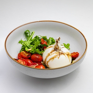 Нежный сыр Буррата в сочетании с соусом Песто, зеленью и помидорами черри.