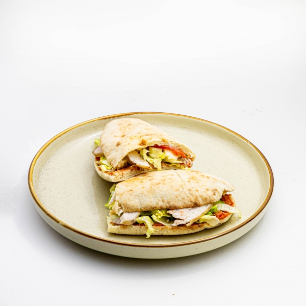 Сэндвич, запеченный в дровяной печи с добавлением курицы, соуса Ранч, томатного соуса, свежих томатов, салата Айсберг и моцареллы.