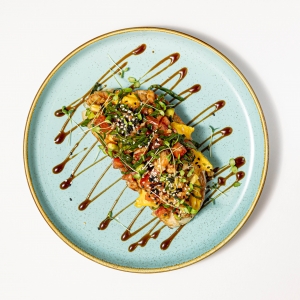 Легкий завтрак в виде брускетты, включает в себя: скрэмбл из 2-х яиц, креветки на гриле, шпинат, авокадо, помидор и соус Терияки.