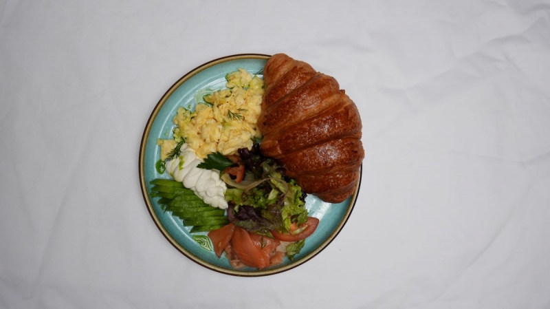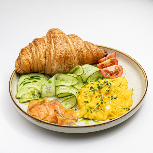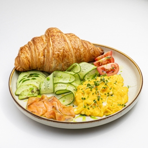 Классический хрустящий круассан в сочетании с нежным скрэмблом из трех яиц. Подаётся с авокадо, слабосоленой семгой, свежими томатами и огурцами.