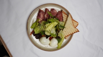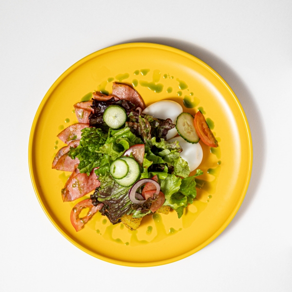 Сытное и питательное сочетание говяжьей ветчины, жареного картофеля, отварных яиц и свежей зелени с овощами.