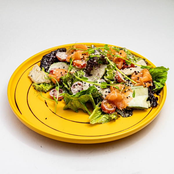 Легкий вариант салата с малосоленой семгой и кунжутным соусом, а также имбирным яблоком, которое придает уникальный вкусовой оттенок.